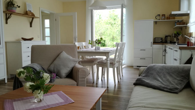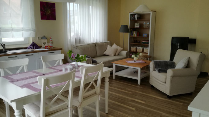 Die 50m² große Einliegerwohnung ist über einen separaten Eingang zu erreichen. Das Schlafzimmer mit einem Doppelbett liegt auf der Rückseite. Im großen Wohn-Koch-Essbreich mit Zugang zur Terrasse und Blick in den Garten sorgt ein Kaminofen für gemütliche Stunden. Im Bad, ausgestattet mit einer Dusche und einem WC, ist auch eine Waschmaschine.